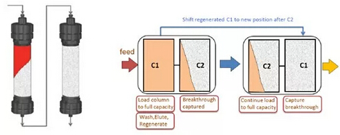 ? ? ? ?Capture SMB是將第一根層析柱的上樣流穿繼續(xù)上樣至第二根層析柱,待第一根層析柱完全滿載后,方結束其上樣,進行淋洗、洗脫等操作,而此時第二根層析柱仍在繼續(xù)上樣。通過切換柱位操作,保證2根層析柱的洗脫、再生、上樣等操作交替銜接進行,保證連續(xù)上樣,從而實現(xiàn)工藝與系統(tǒng)硬件設計的高度契合,使填料利用率最大化,用量大為縮減。