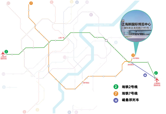 上海新國(guó)際博覽中心戰(zhàn)略性地坐落于浦東經(jīng)濟(jì)開發(fā)區(qū),距離上海新國(guó)際博覽中心600米處有一大型交通樞紐站,即龍陽路站(位于龍陽路上),包括多條路公交線路起點(diǎn)站、軌道交通2號(hào)線龍陽路站、軌道交通7號(hào)線龍陽路站以及磁懸浮列車終點(diǎn)站。從2號(hào)線龍陽路站步行到展館大約需10分鐘;從7號(hào)線花木路站步行到展館大約1分鐘。