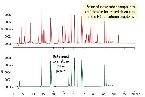 另一種考慮是存在于樣品基質(zhì)中的各種干擾物在每次進(jìn)樣時(shí)可能會(huì)蓄積導(dǎo)致儀器停機(jī)。如果這些干擾物能在樣品制備期間被除去,那么目標(biāo)化合物就能使用一種更簡(jiǎn)單、更穩(wěn)定的方法進(jìn)行分析(圖3)。此圖將位于靠上位置的原始樣品與位于靠下位置的經(jīng)SPE制備后的新樣品進(jìn)行了比較。