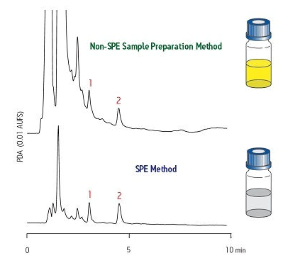 圖5給出了另一個(gè)示例??可系淖V圖表明化合物#1和#2均受到樣品基質(zhì)引起的明顯干擾??肯碌淖V圖表明使用SPE進(jìn)行適當(dāng)樣品制備后可顯著提高結(jié)果質(zhì)量(基線干凈)。請(qǐng)注意,一條明顯更干凈的基線可提高分析結(jié)果的準(zhǔn)確度。如果該樣品需要對(duì)化合物進(jìn)行分離和純化,那么也可以獲得一種純度明顯更高的萃取物。
