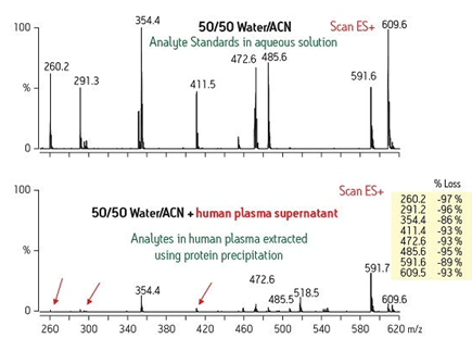 復(fù)雜樣品基質(zhì)帶來(lái)的第二種問(wèn)題在我們觀察質(zhì)譜輸出圖譜(LC/MS或LC/MS/MS)時(shí)可以看到。為了獲得適當(dāng)?shù)馁|(zhì)譜響應(yīng)信號(hào)(靈敏度),必須使該化合物離子化。如果該化合物離子的形成因樣品基質(zhì)干擾物而受阻,那么相應(yīng)的信號(hào)強(qiáng)度也會(huì)大大減弱。