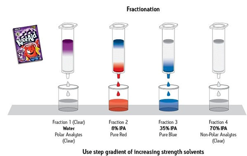 圖8給出了關(guān)于SPE分餾效力的一個(gè)示例。在這里,一種復(fù)雜的干粉樣品(紫葡萄混合飲品)被輕易分離成4種餾分:1種完全由極性化合物組成的餾分、1種純化型紅色化合物、1種純化型藍(lán)色化合物和1種包含所有其余非極性化合物的餾分。