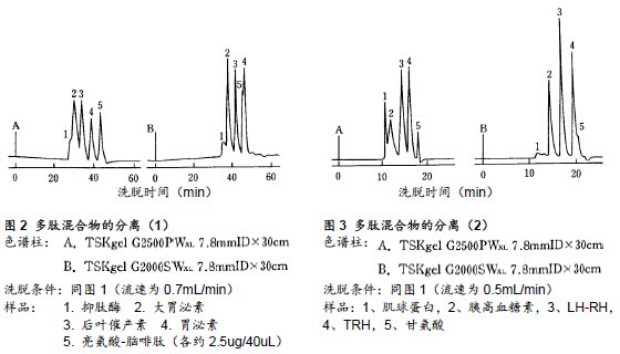 ??? 如上所述,在整體上,TSKgel G2000SWXL具有更高的分離效果,但對(duì)于分子量低于1000的多肽樣品,TSKgel G2500PWXL的分離效果會(huì)更佳。另外,由于TSKgel SW型硅膠填充劑不具有耐堿性,如樣品需要在堿性條件下進(jìn)行分離,或使用NaOH溶液進(jìn)行色譜柱清洗時(shí),請(qǐng)考慮使用TSKgel PW型色譜柱。
