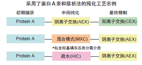 A親和層析法的純化工藝是指第一步捕獲使用蛋白A親和層析,其后步驟使用其他層析模式去除諸如宿主細(xì)胞蛋白、核酸、抗體多聚體和脫落的蛋白A配體等雜質(zhì)的方法。工藝中如果選用陰離子交換層析法(包括陰離子交換膜層析法),則是通過目標(biāo)抗體流穿或吸附并去除雜質(zhì)而達(dá)到純化抗體的目的。