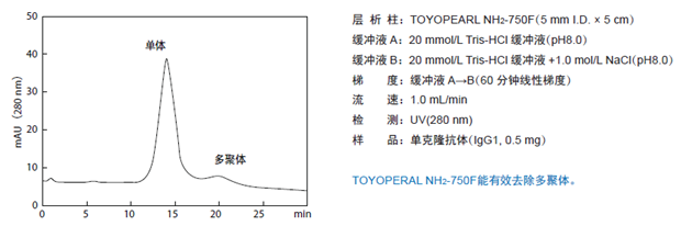 ????陰離子交換填料在抗體的純化工藝中一般通過流穿模式來去除樣品中的宿主細(xì)胞蛋白、核酸、內(nèi)毒素、多聚體等雜質(zhì)。? TOYOPEARL GigaCap Q-650M、TOYOPEARL Q-600C ARTOYOPEARL NH2 -750F 等,均是高載量型的優(yōu)異層析填料。