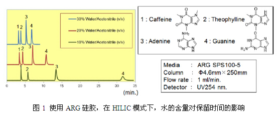在HILIC模式下,通常使用乙腈/水做流動(dòng)相。極性大的洗脫劑使得樣品在ARG硅膠上保留變差,所以增加水的含量,洗脫時(shí)間變短。因此,ARG硅膠的分離模式和反相是不同的;在反相條件下,增加水的含量,保留時(shí)間是增加的。