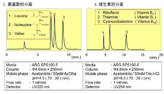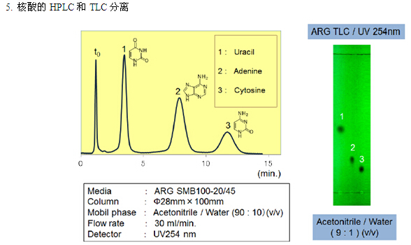 親水化合物一般是用反相模式來進(jìn)行分離,例如使用C18填料。但是,仍然有很多親水的化合物不能用普通的反相模式來分離。近些年來,HILIC模式的填料應(yīng)運(yùn)而生,特別適合分離親水性化合物(極性大的化合物)。富士硅化學(xué)有限公司開發(fā)了HILIC模式的“ARG硅膠”。ARG硅膠可用于分離氨基酸、多肽、維生素和核酸。不同粒徑的ARG硅膠可分別應(yīng)用于分析以及大規(guī)模的分離純化。