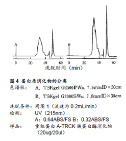 圖4所示為分離基因重組ProteinA的TRCK-胰蛋白酶消化物的實(shí)例。樣品中含有與蛋白質(zhì)消化物分子量不同的各類多肽。如上所示,由于TSKgel G2000SWXL色譜柱的分離范圍較寬,其分離效果也更好。(該樣品通過RPC分析的結(jié)果,可觀察到約有60種多肽峰在RPC下被檢測到)。