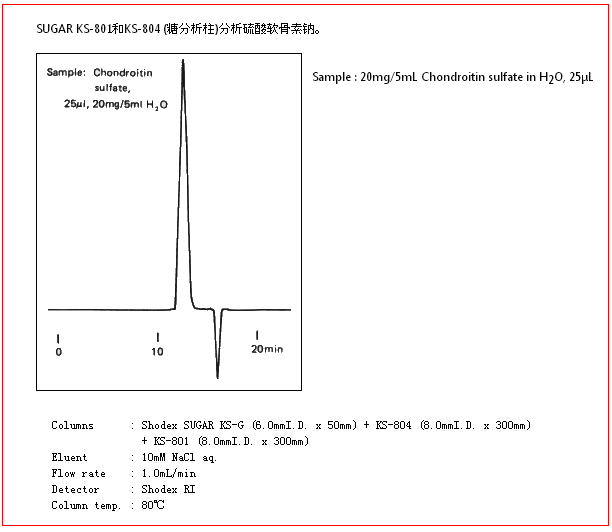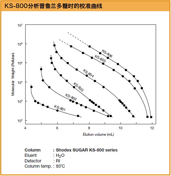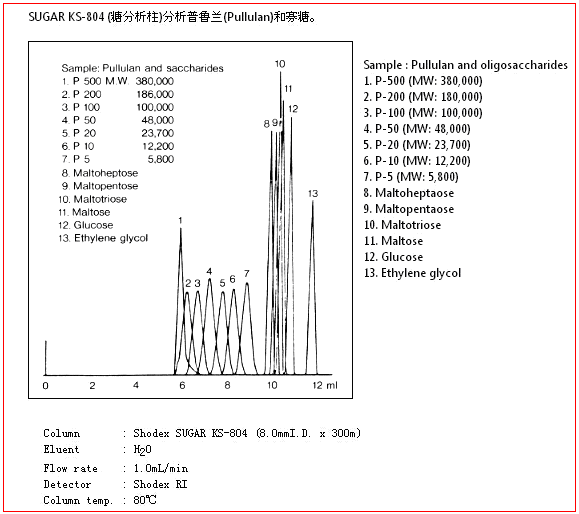 SUGAR KS-804色譜柱是以聚苯乙烯-二乙烯基苯為基質(zhì)的,分離原理結(jié)合了配體交換色譜法和尺寸排阻法,主要用于糖類的分離。用水做流動相即可分離中性糖。
