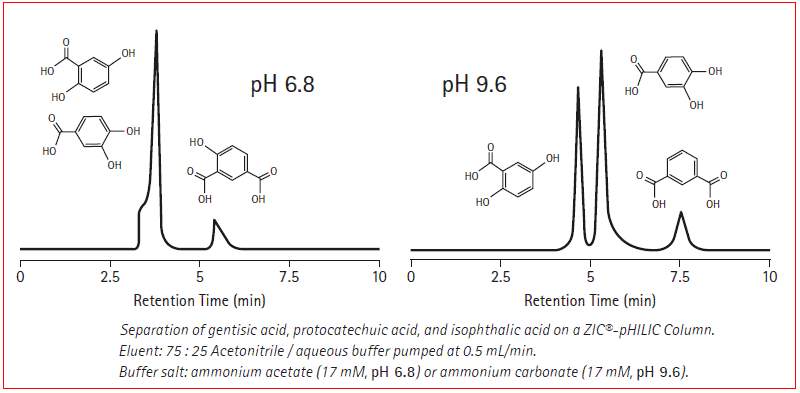 親水作用色譜柱是一種直接分離極性和親水性化合物的色譜技術(shù),為了便于理解,我們可以把它看作為是一種用反相色譜溶劑作流動(dòng)相的正相色譜。因此,HILIC是親水性的流動(dòng)相,以水、有機(jī)溶劑和緩沖鹽作為流動(dòng)相。常見(jiàn)的HILIC方法采用50%~90%有機(jī)溶劑和一定比例的水,并且含有低濃度的緩沖鹽。如乙腈/水/醋酸銨體系。在HILIC方法中,洗脫順序和反相色譜正好相反,即極性越大,保留時(shí)間越長(zhǎng)。