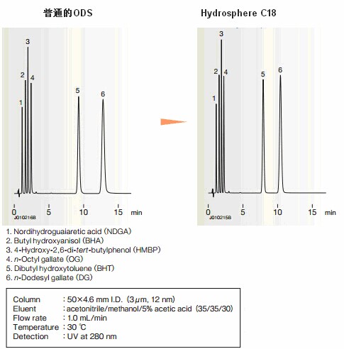 Hydrosphere C18色譜柱與普通的ODS色譜柱相比,通??煽s短20%左右的分析時間。