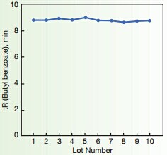 ??? 上圖顯示了疏水性作用的10批生產(chǎn)的批間再現(xiàn)性,這是色譜柱的基本參數(shù),通過對生產(chǎn)過程的嚴(yán)格控制,獲得極穩(wěn)定的批間再現(xiàn)性。其顯示了非常高的批次間重復(fù)性,在分析丁苯時候,以10批柱子的數(shù)據(jù)為例,保留時間的標(biāo)準(zhǔn)偏差小于1.5%,這數(shù)據(jù)大大低于普通的C18色譜柱。分析標(biāo)準(zhǔn)物質(zhì)時,每根色譜柱的理論塔板數(shù)可達(dá)18600,壓力為2600psi。