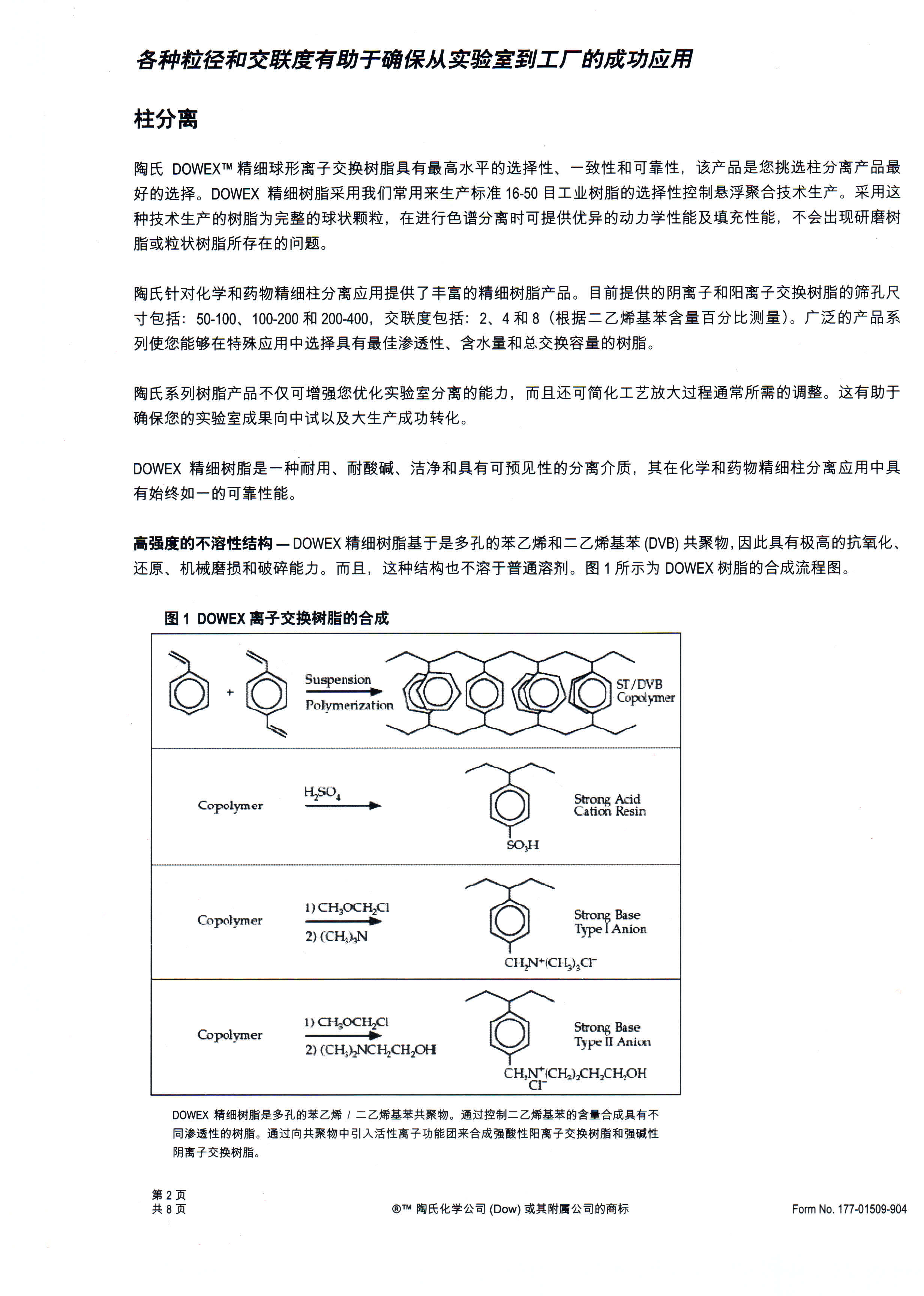 ?????? DOWEX系列離子交換色譜分離樹(shù)脂的骨架材料均為苯乙烯-二乙烯苯,采用特殊的懸浮聚合工藝大規(guī)模制備而得,具有良好的化學(xué)、物理穩(wěn)定性。易裝柱,目標(biāo)組份擴(kuò)散阻力小,產(chǎn)品質(zhì)量穩(wěn)定。因此,DOWEX系列離子交換色譜分離樹(shù)脂不僅可以滿足實(shí)驗(yàn)室食品、藥品等精細(xì)化工產(chǎn)品的小試工藝開(kāi)發(fā),也使得工藝的放大更為輕松。