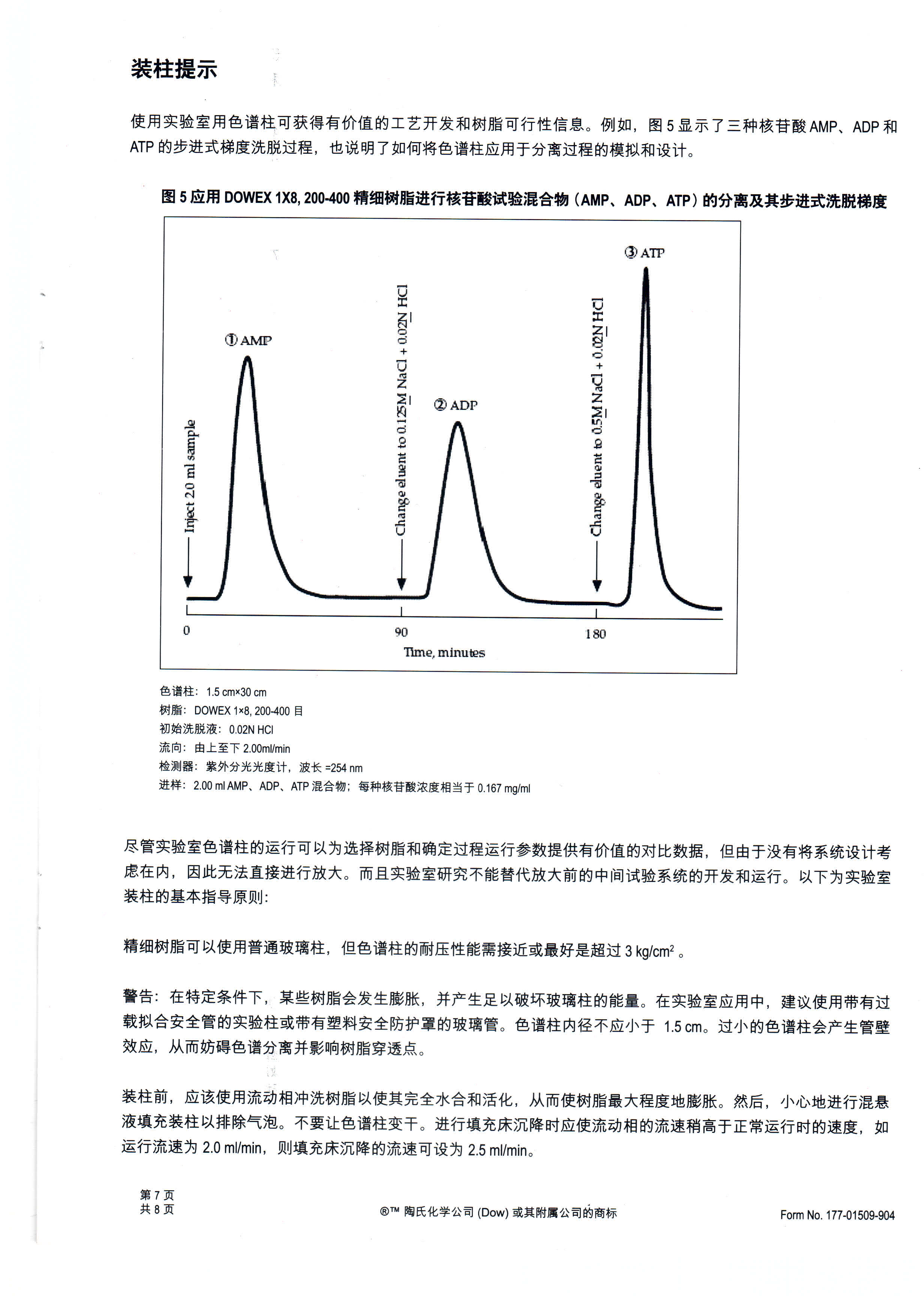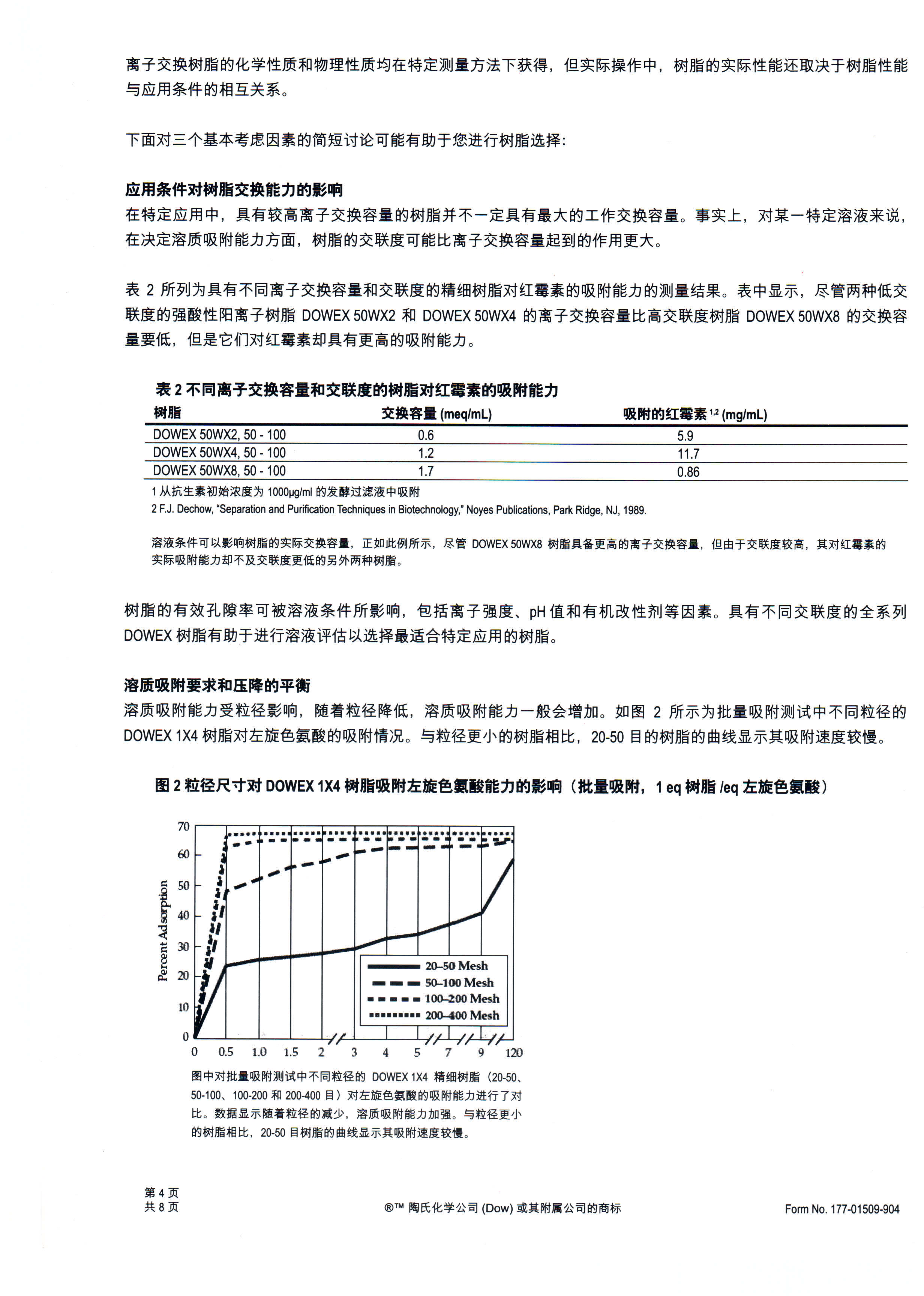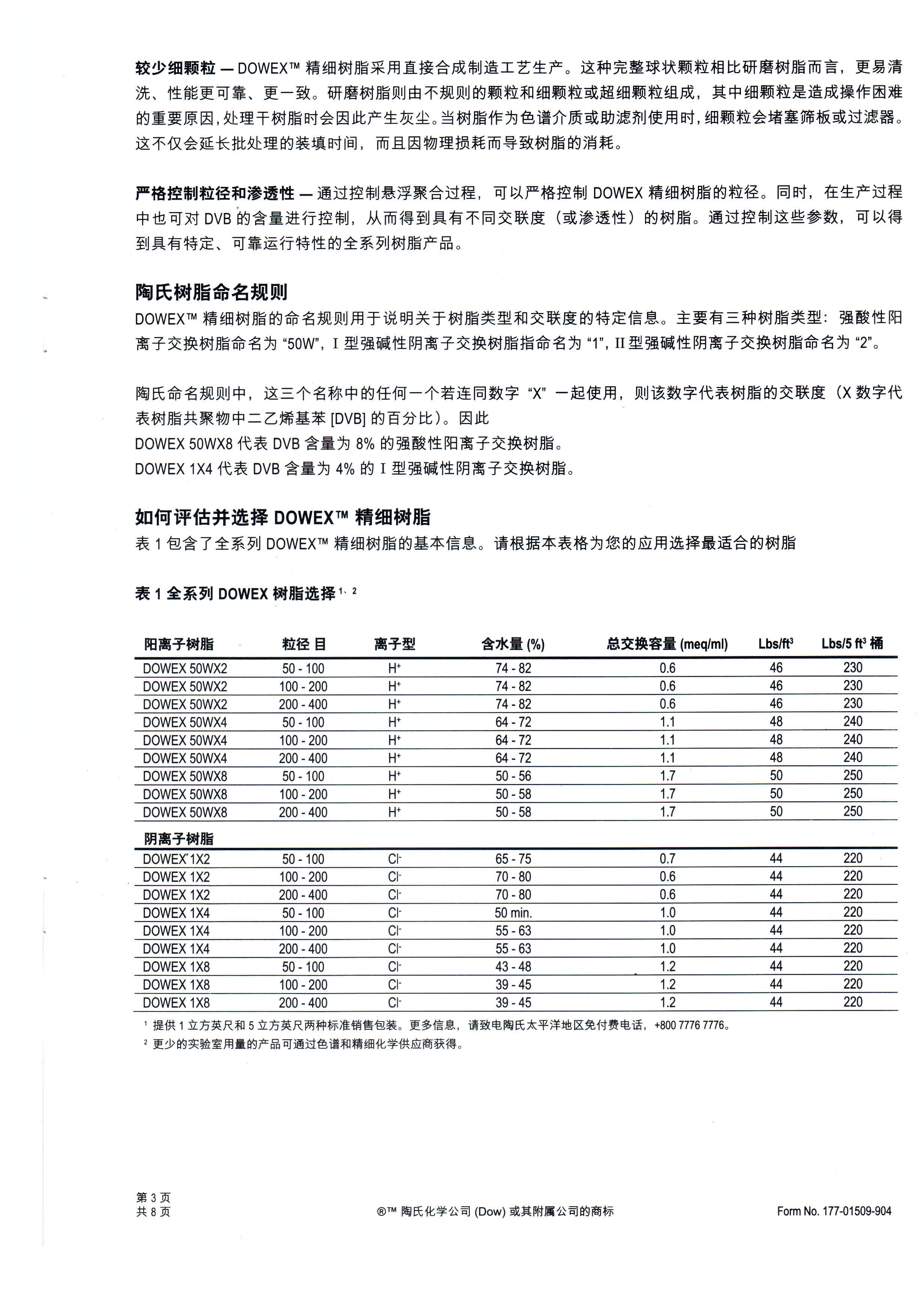 ?????? DOWEX系列離子交換色譜分離樹(shù)脂有強(qiáng)酸性陽(yáng)離子交換樹(shù)脂和強(qiáng)堿性陰離子交換樹(shù)脂兩大類(lèi),每一類(lèi)又根據(jù)交聯(lián)度(即DVB%)的不同劃分為3個(gè)小類(lèi),分別以“×2”、 “×4”與“×8”表示,在此基礎(chǔ)上進(jìn)一步提供3個(gè)粒度范圍可供選擇,即150-300μm(50-100目)、75-150μm(100-200目)以及35-75μm(200-400目),共計(jì)18個(gè)樹(shù)脂牌號(hào)。顯然,不同交聯(lián)度的樹(shù)脂含水量不一,體積交換量、物質(zhì)擴(kuò)散的阻力各異,如此寬泛的產(chǎn)品范圍豐富了客戶的試用選擇,可以針對(duì)具體的應(yīng)用優(yōu)選出適宜的色譜分離樹(shù)脂。