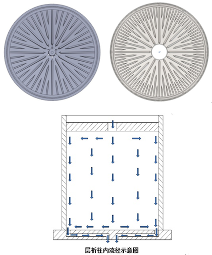 分配器按照現代機械設計先進理念進行的,流體動態(tài)仿真、優(yōu)化設計、可靠性設計、虛擬設計、三維造型、產品全壽命周期設計,使得產品性能得到有一種單一的中央噴口和一種徑向導流槽。防直噴的噴口與導流槽做在了一起,定位在每個單元的中心,防止噴出的液體直接進入柱管而不通過分配器。獨特的分配器設計,保證所有流徑長度相同,從而更有效地保證分配效果。