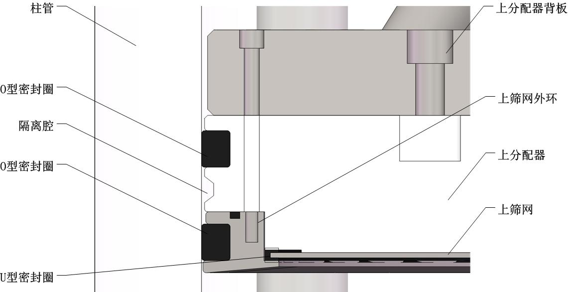 層析柱密封結構主要考慮密封的可靠性、有效面積最大化和死體積的最小化三個方面。柱頭的密封形式如下圖所示,柱管與移動的柱頭之間采用雙層O型密封圈進行密封,起到雙重密封的作用。
